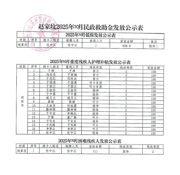 赵家坟村2025年10月民政救助金发放公示