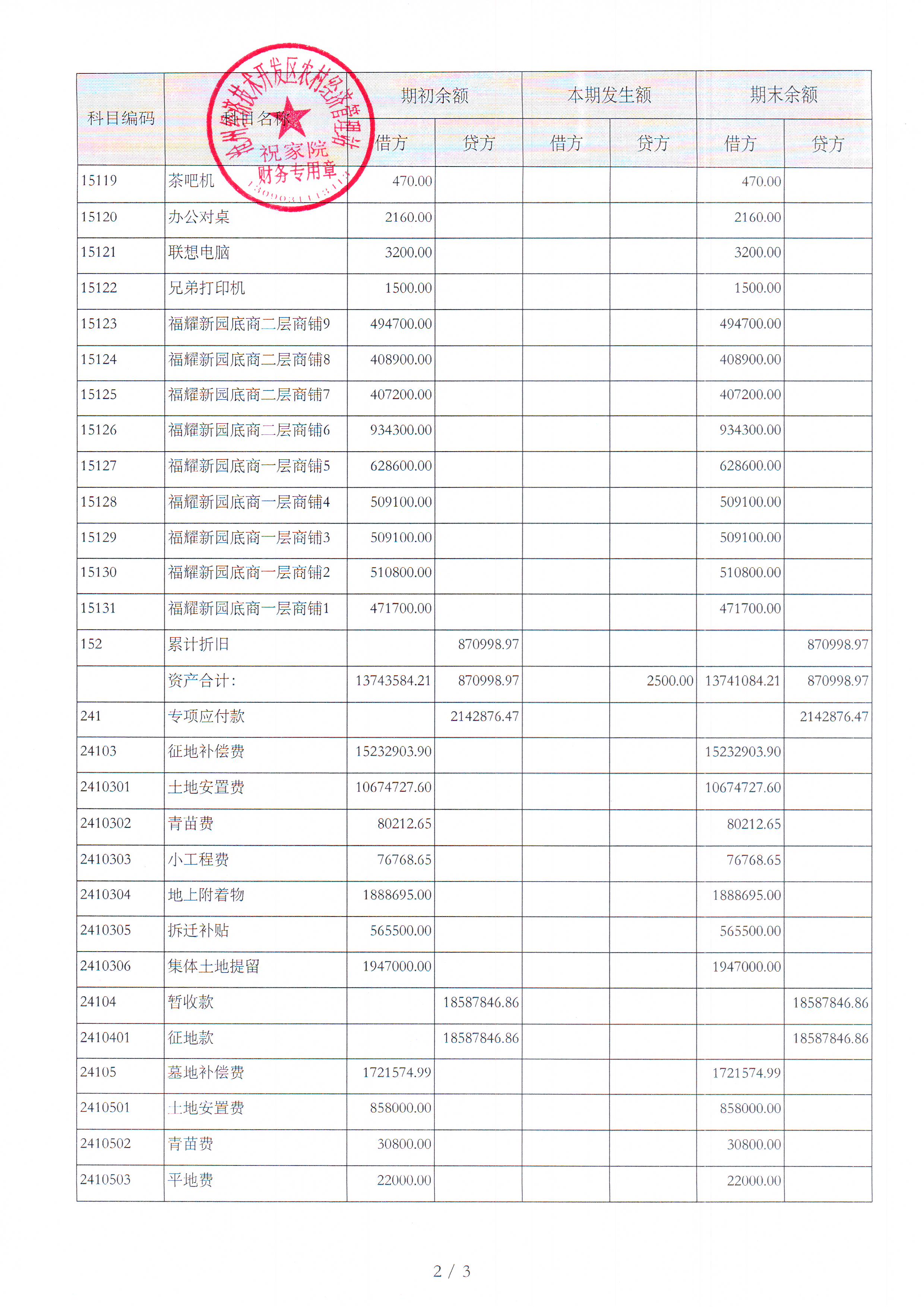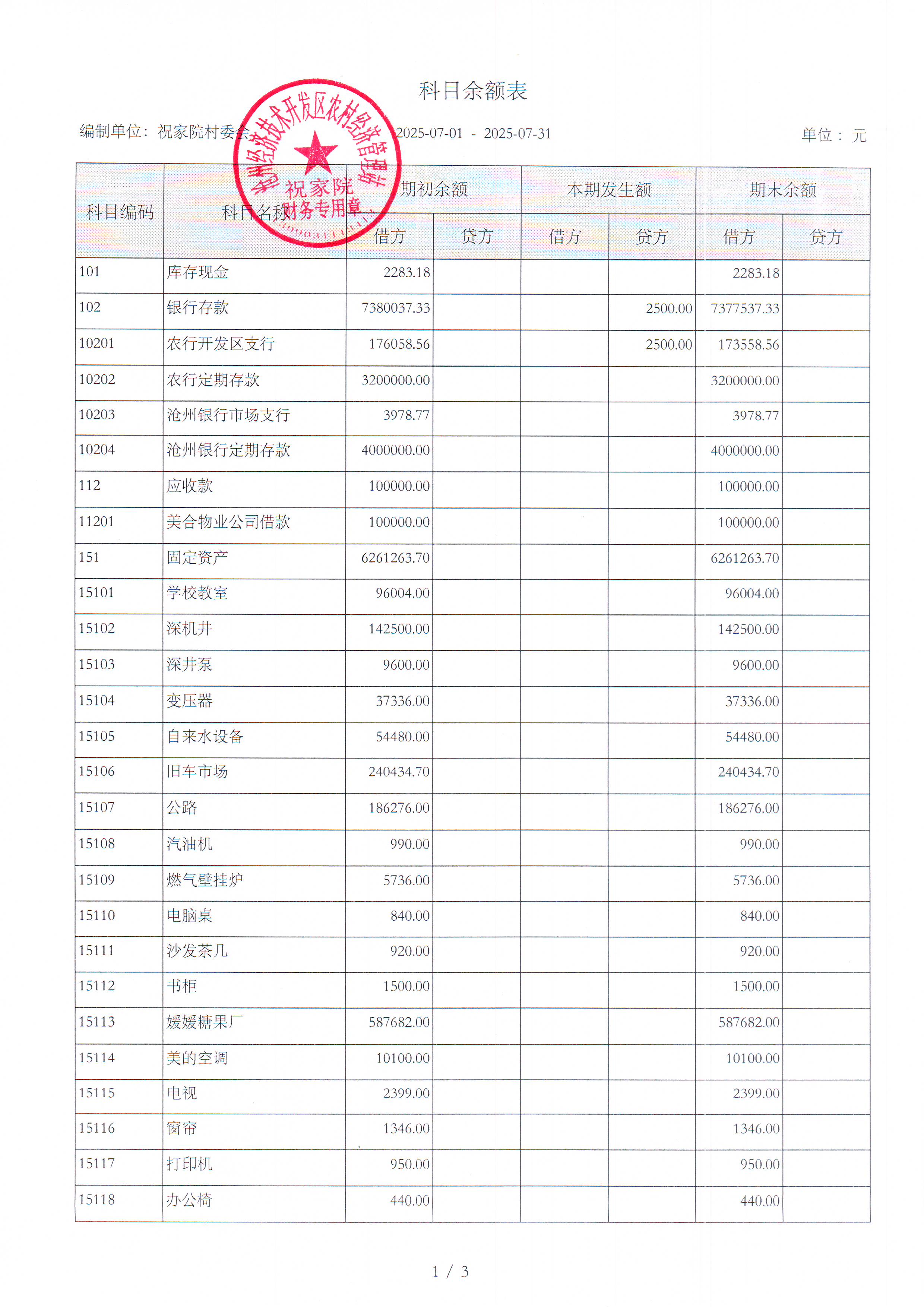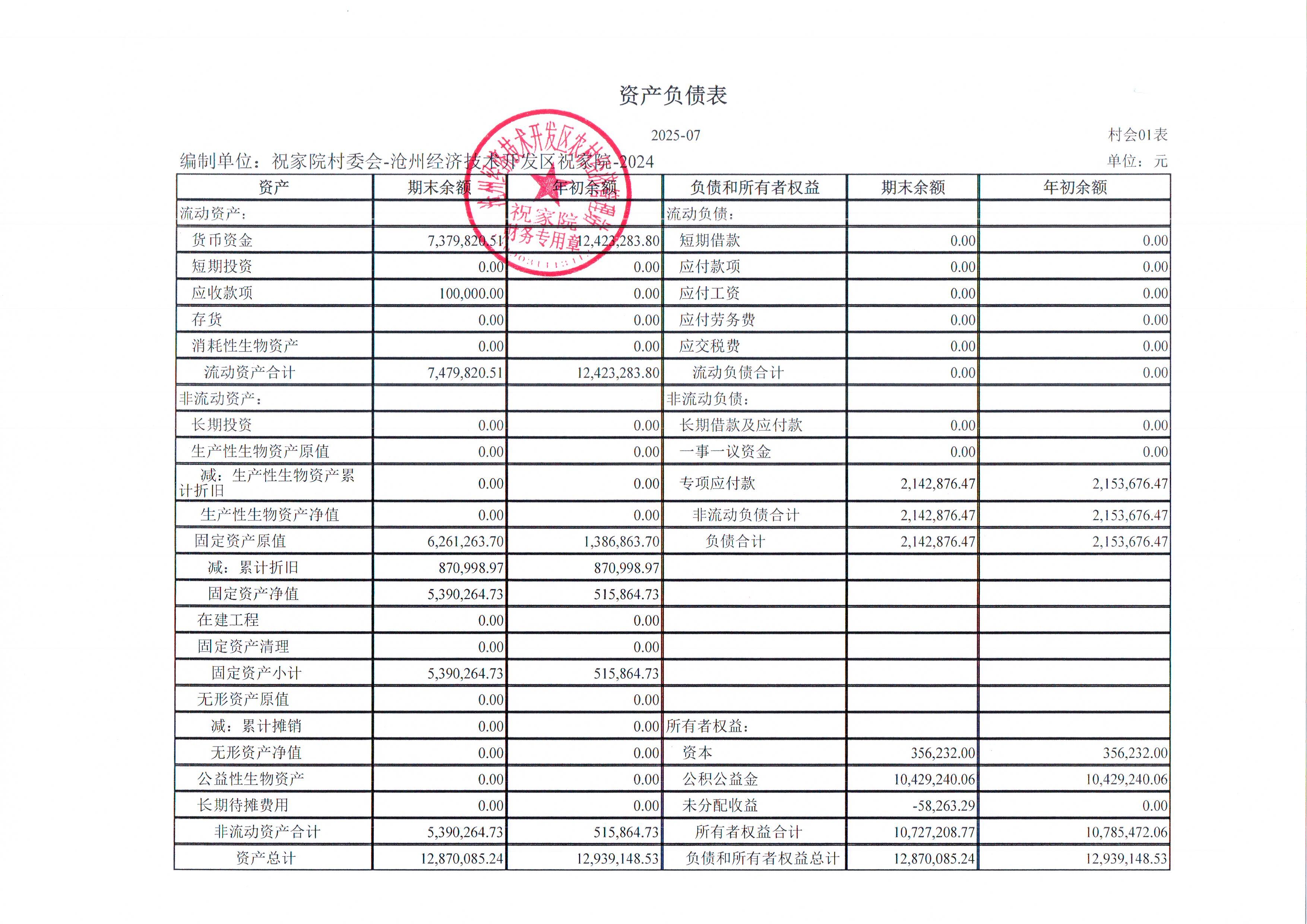 祝家院村2025年7月财务公开