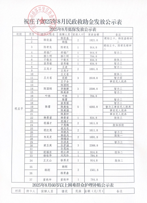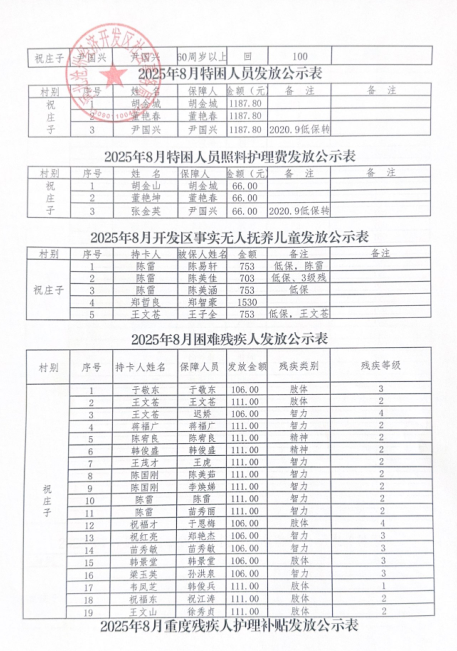 祝庄子村2025年8月民政救助金发放公示